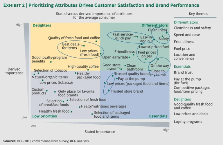 Convenience store leaders need to carefully prioritize these various attributes in order to drive customer satisfaction and brand performance. (See Exhibit 2.) Cleanliness, for example, falls in the differentiators quadrant. It received a high score on stated importance because consumers indicated that they valued the attribute highly when we asked them whether cleanliness is an important factor in their determination about which convenience stores to visit. It also received a high score on derived importance because consumers’ overall satisfaction with particular convenience retailers strongly correlated with how consumers rated the retailers’ performance on cleanliness.