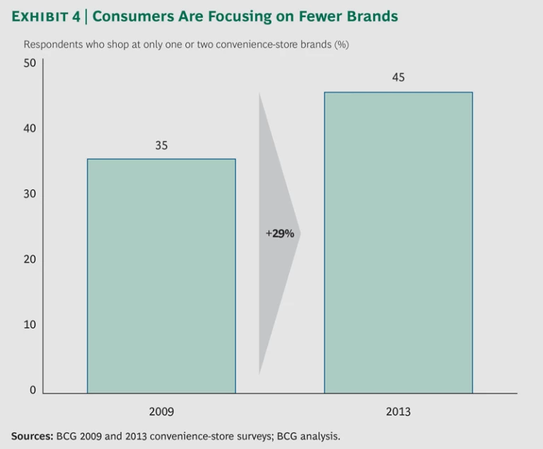 Our research also suggests that the top convenience-store brands have been increasing their lead. As these brands have improved their performance on differentiators, the portion of consumers who said they concentrate all their spending on one or two brands rose from 35 percent in 2009 to 45 percent in 2013. Over this same period, the three brands with the highest share of wallet saw their combined share grow at a rate that was 4.5 percent faster than the combined rate of growth for all the other brands we considered.