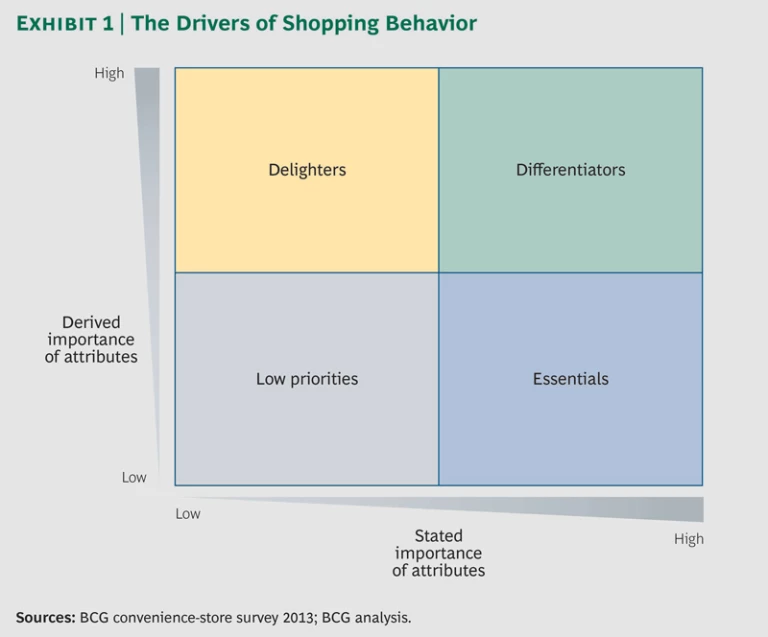 - Delighters. These attributes are welcomed but not expected by consumers; delighters are a potential future basis of distinction for retailers. For example, some convenience stores are stocking good-quality, fresh food—pleasantly surprising many consumers and enabling some retailers to lay the foundations for future competitive advantage.