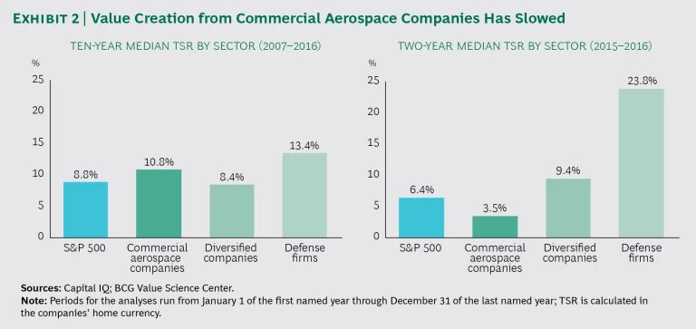 In the 2015 analysis, however, which looked at performance through the end of 2014, commercial aerospace contributed significantly to overall value creation for the A&D industry. Over the two years since then, the commercial sector has created less value, owing in large part to investor expectations of slowing growth. Commercial OEMs are working through record-high order backlogs, and both Boeing and Airbus have increased production rates for key platforms (the B737 and A320 families, respectively). Orders for new aircraft continue to come in, but investors see this growth slowing and are giving these companies’ stocks lower valuation multiples. As a result, the median TSR performance for commercial aerospace companies declined over the two-year period of 2015 through 2016, to 3.5%—a significant drop from the TSR of 11.5% for the period from 2007 through 2014.