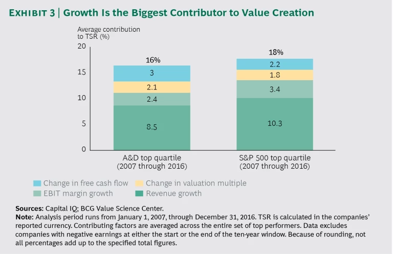 Another similarity between the analyses in 2015 and this year is that sales growth is still the dominant factor in creating value. For the top quartile of performers, 53% of TSR (8.5 percentage points) comes from revenue growth—a figure largely in line with data for the S&P 500. (See Exhibit 3.)