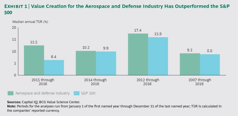 The results of our value-creation analysis largely track the findings from a similar study conducted in 2015. (See Aerospace and Defense Value Creators Report 2015, BCG report, June 2015.) That study found that A&D companies had outperformed the broader market—which remains true today. For the past two, three, five, and ten years, the median A&D company has outperformed the S&P 500 in TSR. (See Exhibit 1.)