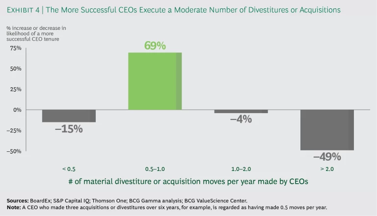 Our research showed how CEOs’ success is strongly linked to both the number and the type of moves that they make. The more successful CEOs made portfolio-reshaping moves—significant divestitures and acquisitions with disclosed terms—in a “sweet spot” of change: enough to stimulate but not so much as to overwhelm. To put it another way, they balanced urgency and restraint, evolving the portfolio rather than letting it sit as is or pursuing too much portfolio change at once (by making more than one deal per year, for instance) (See Exhibit 4.)