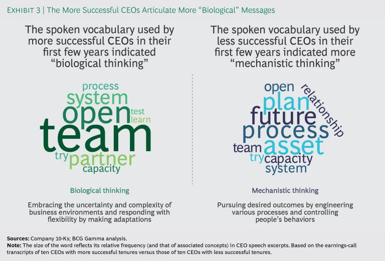 One of our study’s interesting findings, emerging from the natural language processing (NLP) analysis that we used, was that the more successful CEOs, particularly during their first few years in office, tended toward “biological thinking” rather than “mechanistic thinking”—suggesting a greater sensitivity to context changes, greater agility, and a greater readiness to make appropriate