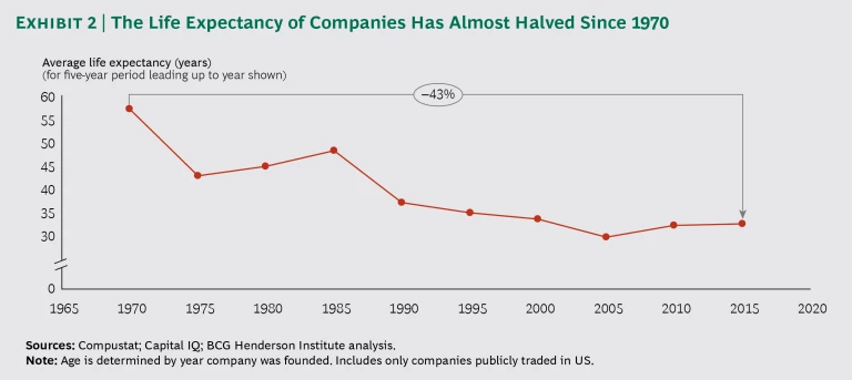 Finally, our research indicates that US companies’ life expectancy is shrinking: it almost halved (-43%) since 1970, and the risk of disappearing—either by bankruptcy or through M&A moves—in five years has risen to more than 30%. (See Exhibit 2.)
