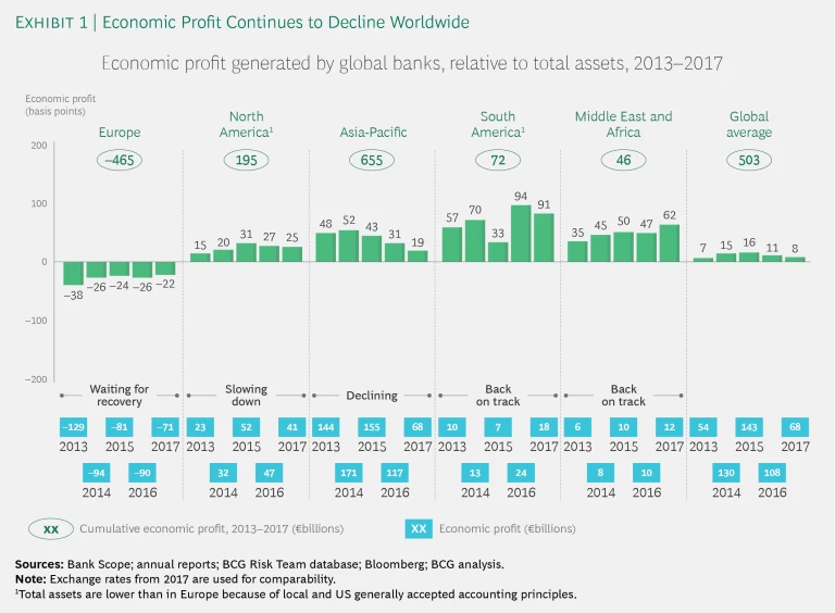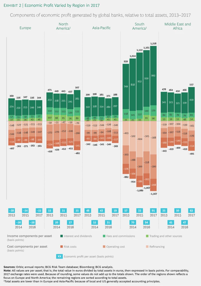 The major markets—Europe, North America, and Asia-Pacific—continue to run at different rates, hobbled or aided in turn by the strength of the economic recovery in each region, the ongoing impact of NPLs, and stubbornly high cost structures. As a result, EP varied considerably by region. (See Exhibit 2.)