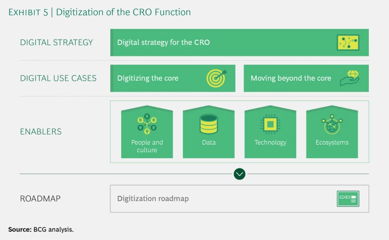 Realization of that potential will require risk leaders to develop a well-aligned digital strategy. That strategy should be based on a comprehensive assessment of the market and competitors, the bank’s strategic objectives, its overall digital maturity, and its major operational and customer pain points. The CRO can use those insights to digitize its core functions, expand digital capabilities to other parts of the bank, and make sure that all critical enablers are in place. (See Exhibit 5.)