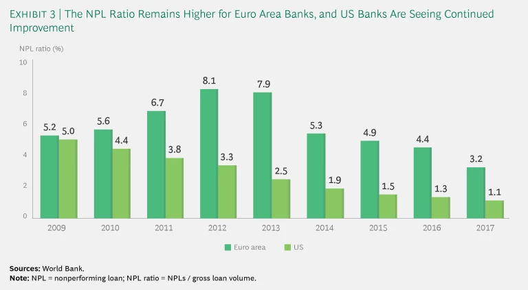 The third major issue is the NPL burden. (See Exhibit 3.) While banks in the US have steadily lowered their NPL ratio from a high of 5.0% in 2009 to 1.1% in 2017, Europe’s story was different. Across the euro area, the NPL ratio continued to climb, rising from 5.2% in 2009 to 8.1% in 2012 before decreasing to 3.2% in 2017—still nearly three times the US level. Along with geopolitical uncertainty and cybercrime, the NPL problem has been designated one of the European Central Bank’s three critical supervisory priorities for 2019. The ECB notes that even though many banks have been able to reduce legacy NPLs, the ongoing ratio remains high. While market conditions are still depressed, the danger is that banks’ search for yield could give way to excessive risk taking, possibly pushing NPL ratios even higher.