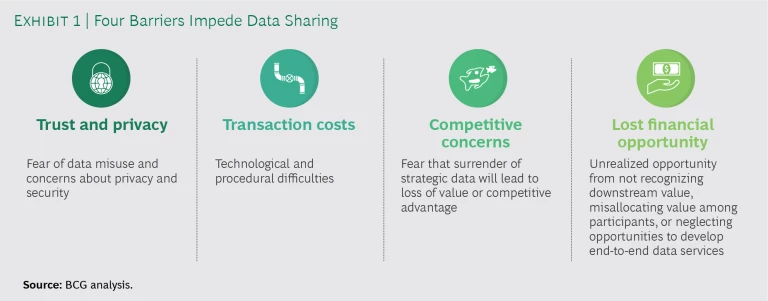Our research and client experience show that problems with data sharing generally revolve around four issues: trust and privacy, transaction costs, competitive concerns, and worries over missed or lost financial opportunity. (See Exhibit 1.)