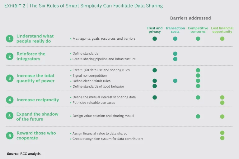 Simple and effective rules of governance can help break the data gridlock. But in the face of many possible design choices, companies don’t always know where to start. A good first step is to understand that data sharing in an ecosystem is fundamentally an issue of cooperation, with rules guiding good behavior and setting the terms of engagement. BCG’s Smart Simplicity framework, which is designed to help companies make sense of organizational complexity and encourage cooperation, can help.