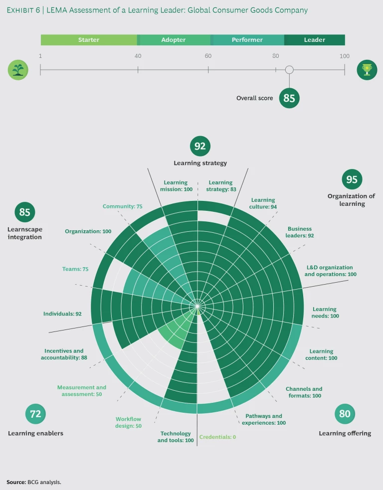 Our assessment of one of the world’s leading global professional services corporations indicated that it was a learning performer—one maturity level higher than the airline company—with an overall LEMA performance score of 71 points. (See Exhibit 5.) In some dimensions, it was outstanding, earning scores of 96 for its learning mission, 89 for its channels and formats, and 81 for its learning culture. These areas of strength signaled that the company’s leaders saw a link between individual employee learning and the overall success of the company, and that they had established a clear “why” for learning. But in other dimensions—the availability of learning credentials, for example, and the inclusion of learning activities in the workflow—the company was much less impressive.