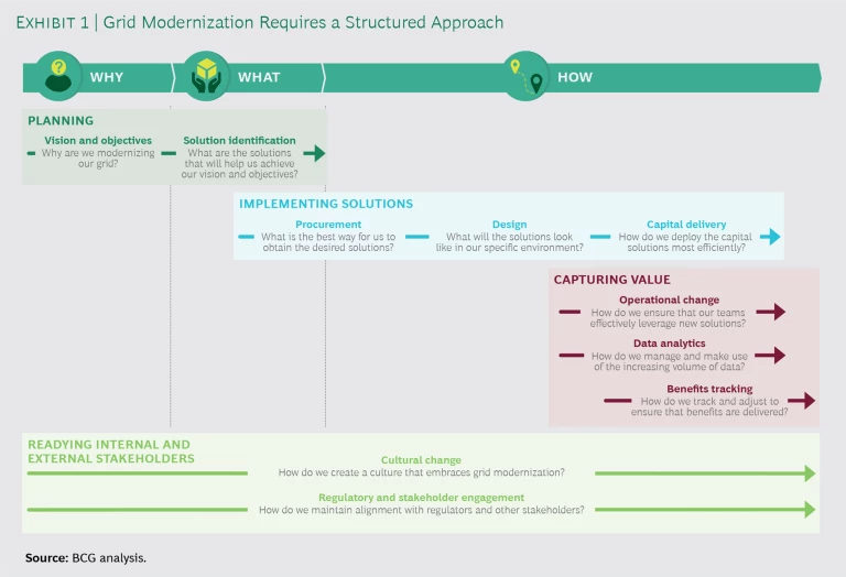 Most utilities that have difficulties modernizing their grid start with a single, all-encompassing question: How do we modernize our grid? As a result, these companies can get lost in the weeds of various technological solutions and fail to define what they are trying to achieve. Using a why-what-how framework, we help utilities break down the process into smaller components. (See Exhibit 1.) At the outset, companies set a vision and objectives by asking, Why are we modernizing our grid? This naturally leads to the next question: What are the solutions that will help us achieve our vision and objectives? After the what is defined, utilities are ready to address the how.