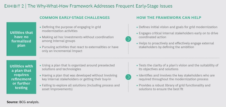 Applying a why-what-how framework helps a company develop an effective modernization plan from scratch. The framework can also act as a stress test for an existing plan. By breaking the task of modernizing a grid into discrete phases, the framework helps companies tackle early-stage issues, such as making ad hoc investments without first coordinating internally or using a plan that is organized around preselected solutions. The framework helps tackle these challenges by ensuring greater clarity and unity of purpose, better agreement among internal and external stakeholders, and more effective execution from conception through delivery. (See Exhibit 2.)