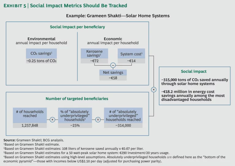 To quantify the impact per beneficiary, key performance indicators must be tailored both to the social problem addressed by the business and to the social benefits expected. For example, a social business that provides green energy, such as Grameen Shakti, should measure the environmental and economical impact of its products. An initial analysis comparing Grameen Shakti’s solar home systems to the kerosene alternative, for instance, suggests that the average household with a home system reduces its carbon dioxide levels by roughly 0.25 tons per year and generates net annual savings of €58.