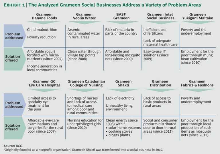The report has been written in collaboration with Professor Muhammad Yunus, Nobel Peace Prize Laureate 2006, founder of the Grameen Bank, and early developer and implementer of the social business concept. It is based on an analysis of the lessons learned from ten social businesses that operate in Bangladesh today, each tackling a different social problem affecting people at the bottom of the economic pyramid. (See Exhibit 1.)