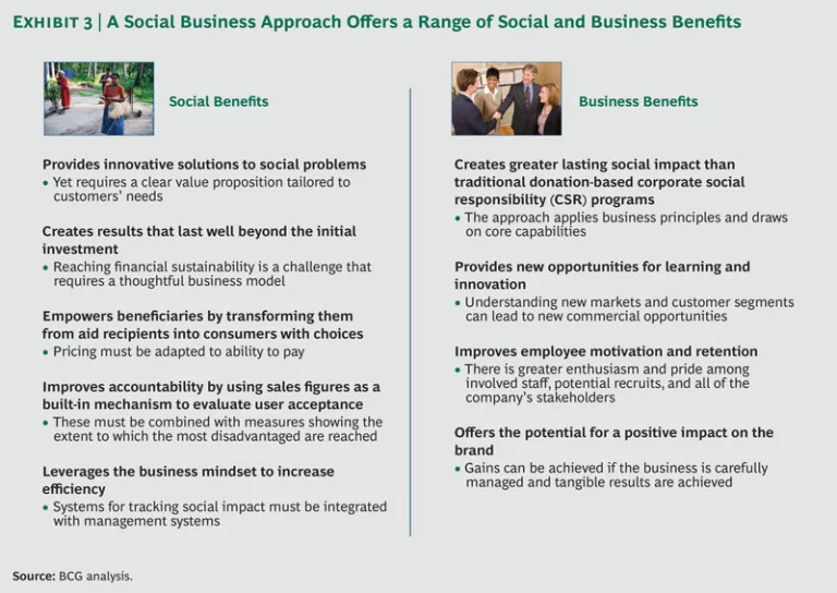 Unlike traditional, donation-based corporate social responsibility (CSR) activities, social businesses allow companies to directly use their skills, expertise, and business network to address a particular social problem. In this way, social business activities can be aligned with the core commercial business. If designed and managed effectively, this alignment not only generates lasting social impact but also can lead to tangible business benefits.