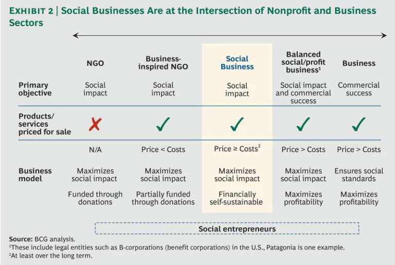 On this spectrum, social businesses fall somewhere between traditional NGOs and for-profit companies. (See Exhibit 2.) Like NGOs, their primary objective is to create social impact. At the same time, they operate like businesses and aim to generate sufficient revenues to at least cover their operating costs. Other emerging models, which lean further to the business side, try to weigh profit and social objectives equally; for instance, by aiming to generate at least a minimum profit while also pursuing a social impact goal. More toward the nonprofit side, business-inspired NGOs aim to generate at least some additional revenue by pricing their services, yet without the ambition to reach financial sustainability.