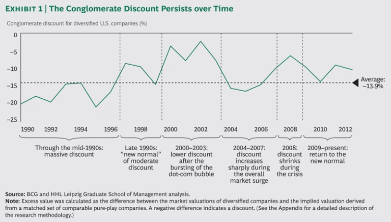 In a joint study conducted in the aftermath of the financial crisis, BCG and the HHL Leipzig Graduate School of Management found that the conglomerate discount shrank from 2005 through 2009. (See The Power of Diversified Companies During Crises, BCG report, January 2012.) But this reduction turned out to be only a temporary reprieve. Continuing our research, BCG and HHL’s latest study found that the conglomerate discount rebounded during the global economy’s tenuous recovery. Among companies publicly listed in the United States, the discount has increased to its precrisis range of –10 to –15 percent after shrinking to approximately –7 percent during the crisis. (See Exhibit 1.)