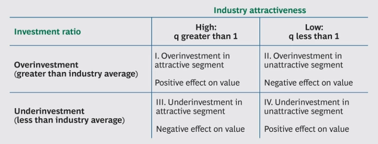 In general, overinvestment in attractive segments (quadrant I) and underinvestment in unattractive segments (quadrant IV) have a positive effect on a diversified company’s value. In contrast, overinvestment in unattractive segments (quadrant II) and underinvestment in attractive ones (quadrant III) indicate an inefficient allocation of funds and imply a negative effect on company value.