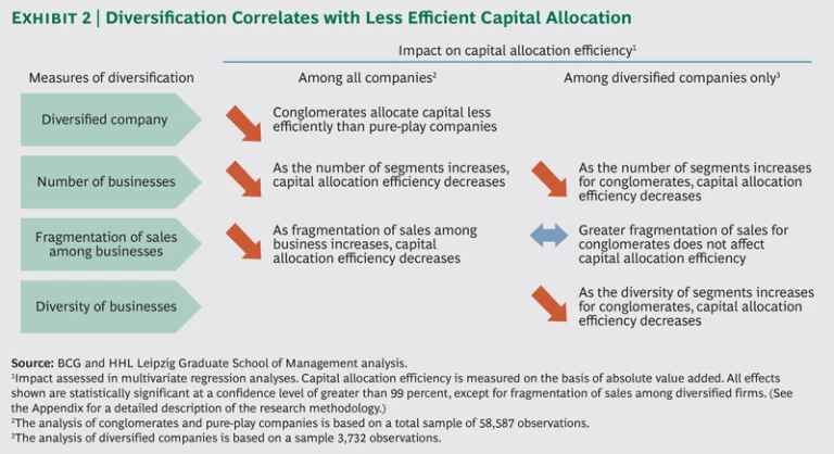 Diversity and Capital Allocation Efficiency. Diversified companies allocated capital less efficiently, on average, than pure-play companies in our study. (See Exhibit 2.) For the entire sample, companies with a larger number of businesses had lower efficiency in capital allocation. Notably, companies with greater fragmentation of sales among their businesses showed less efficiency in allocation than those with sales concentrated in their main businesses. Among diversified companies specifically, greater complexity—in terms of both the number and the diversity of businesses—reduced capital allocation efficiency. For these companies, concentration of sales in their main businesses was not a significant factor in maintaining high capital-allocation efficiency.