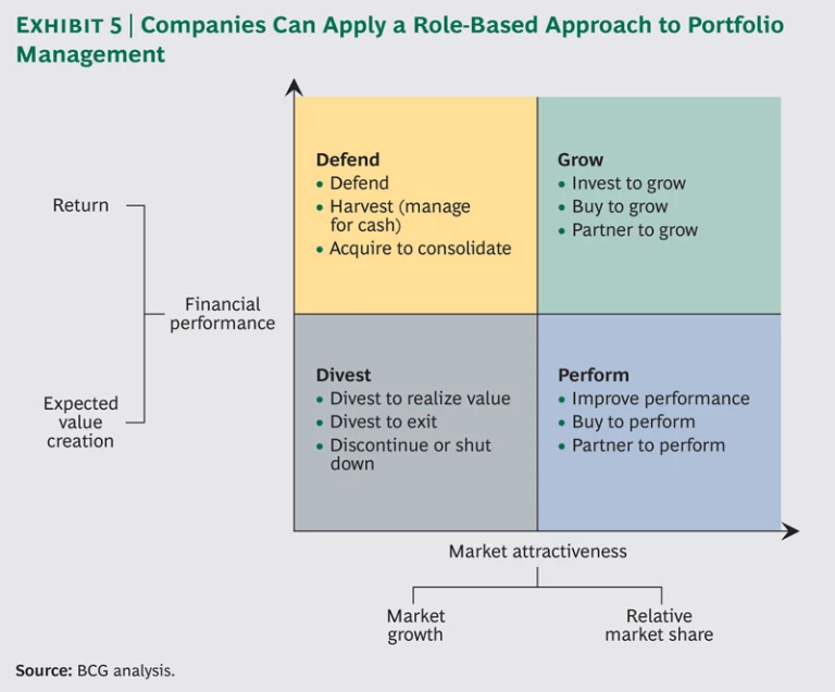 For example, a four-role classification based on market attractiveness and financial performance can be used to segment a portfolio and prioritize businesses for capital allocation or divestiture. (See Exhibit 5.) Market attractiveness is determined by the forecast market growth and the business’s current relative market share—that is, both the opportunity for growth and how well positioned the business is to successfully capture it. Similarly, financial performance is based on both current returns and the opportunity for future value creation.