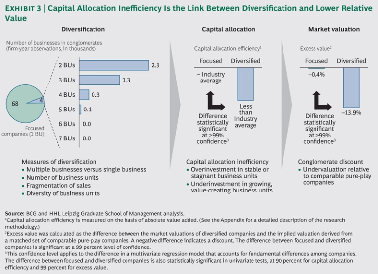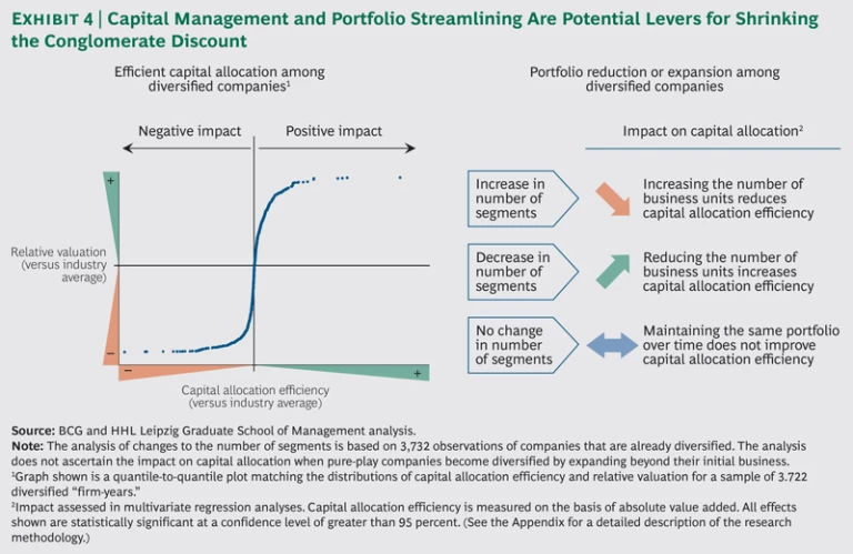 Capital allocation inefficiency thus emerges as the link between diversification and the conglomerate discount. (See Exhibit 3.) Diversified companies suffer from lower relative valuations not because of diversification per se, but because their portfolio complexity makes it challenging to allocate capital efficiently. This insight points to greater efficiency in capital allocation as the primary objective for diversified companies’ efforts to shrink the conglomerate discount or even turn it into a premium.