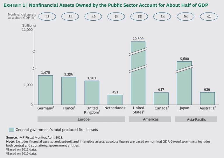 The potential benefits of asset-optimizing strategies stem in large part from the size of the asset base under government control. In major developed countries, according to the International Monetary Fund, nonfinancial assets owned by the government (including central and local authorities) can range from about 35 to more than 90 percent of GDP. (See Exhibit 1.) In Europe, that figure is about half of GDP.