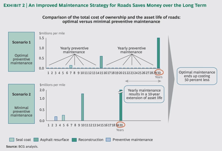 Reducing Total Cost of Ownership. The key here is to carry out timely and appropriate maintenance, avoiding unplanned service disruptions—as well as the higher costs typically associated with emergency repairs—and extending the life of certain assets. At a U.S. city’s transportation authority, it was estimated that the implementation of systematic preventive road maintenance instead of a program of bare-minimum maintenance would lead to a 50 percent decline in annual cost-per-mile spending. The program offered the added benefit of extending the life of the roadways by a full ten years. (See Exhibit 2.)