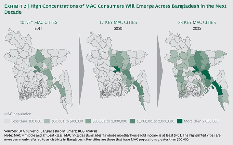In the second wave, major concentrations of buying power will emerge in other places across most of the country. The MAC population will more than double in Dhaka over the next decade, and it will more than triple by 2025 in Rajshahi, an industrial center in North Bengal, and in Barisal, a southern port city. We project that the MAC population will increase sixfold in Khulna, an important, fast-growing industrial hub in southwest Bangladesh. In all, we project that by 2025, compared with only 36 today, 61 cities in Bangladesh will have MAC populations of 100,000 or more—a market big enough to be firmly on the radar of a global company. The number of cities with clusters of more than 300,000 such consumers will more than triple, to 33, by that time. (See Exhibit 2.) At first, growth will occur most rapidly in eastern cities such as Lakshmipur, Gazipur, and Brahmanbaria and then in such western cities as Jessore, Tangail, and Jhenaidah. This second wave of regional dispersion will require many companies to expand their infrastructure, distribution, financial management, and capabilities to many more cities in order to serve important new markets.