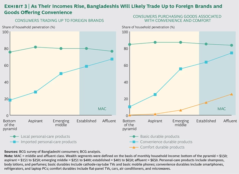 A Growing Desire to Trade Up. An analysis of consumer takeoff curves for consumer durables in Bangladesh illustrates that, as their incomes rise, consumers tend to trade up to products that offer greater convenience and comfort. By the time consumers attain the aspirant monthly household income of at least $151, around 80 percent already own a color TV, and more than 90 percent have a basic mobile phone.