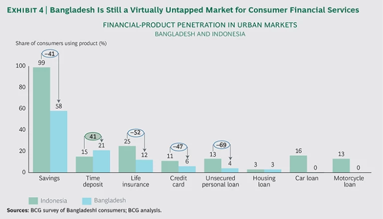 In some major product categories, the Bangladeshi market has barely been tapped. One such category is financial services. As mentioned above, very few Bangladeshis use credit cards or take out loans to purchase homes or automobiles. Penetration is also relatively low in other basic consumer financial products. Comparisons with Indonesia are enlightening. Only 58 percent of Bangladeshi consumers we surveyed have savings accounts, compared with 99 percent of Indonesians. Just 12 percent have life insurance policies, compared with 25 percent of Indonesians. (See Exhibit 4.) This indicates that for companies that can offer affordable terms and can establish themselves as trustworthy, there are potentially huge untapped opportunities in Bangladesh for consumer financial products—especially as households enter the market for big-ticket items such as cars, larger homes, and major appliances that require financing.