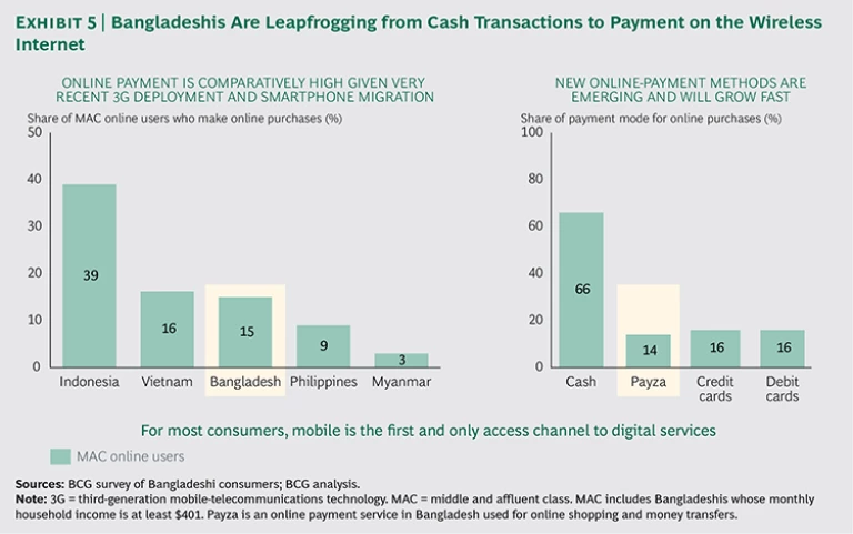 E-commerce remains nascent in Bangladesh, however. Only 15 percent of MAC households reported that they shop online, compared with 39 percent in Indonesia. Still, MAC consumers are twice as likely as lower-income consumers to purchase products online. As the incomes of households rise, therefore, it is likely that so will consumers’ preference for shopping online. Consumers in Bangladesh are also using diverse online-payment methods. For example, around 14 percent of online purchases—almost as many as those made with credit cards and debit cards—currently are conducted through Payza, an online payment service. (See Exhibit 5.) We expect that these alternative payment nodes will grow rapidly.