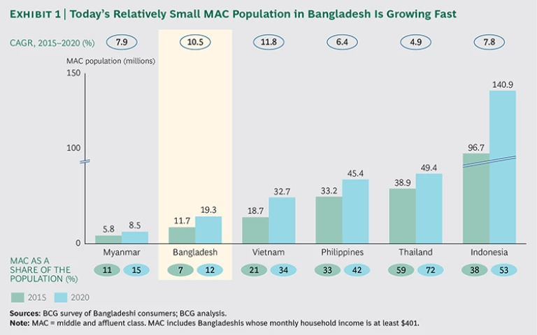 What is even more important for consumer product companies is that Bangladesh’s MAC population is expanding rapidly—by an average 10.5 percent annually. That compares with 7.8 percent annual growth in Indonesia, 7.9 percent in Myanmar, and 4.9 percent in Thailand. (See Exhibit 1.) If Bangladesh can maintain this pace, its MAC population will grow by 65 percent over the next five years. By 2025, it is expected to nearly triple, to about 34 million.