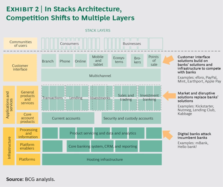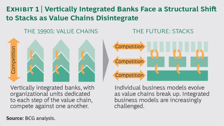 These changes to the banking industry’s structure are in their early stages, and further shifts toward the stacks structure are likely. A greater proportion of banks’ revenues will therefore become vulnerable to attack by new entrants at various layers.