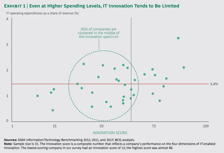 The results of BCG’s biennial survey show how CPG CIOs are responding to the new pressures. Most IT organizations still have a long way to go to meet the digital innovation imperative. Only about one-third of this year’s participants qualifies as innovative. On the bright side, they have made good progress in reducing IT spending. The savings may provide them with funds that they can plow into innovation.