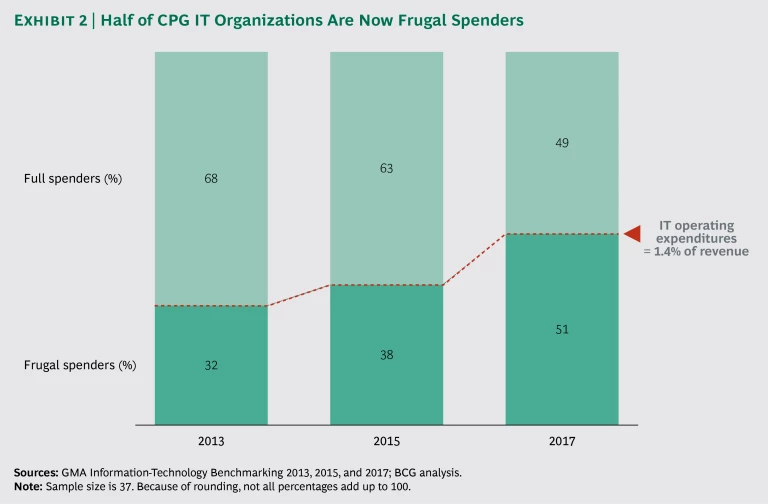 An area where CPG IT organizations have made significant progress is in reducing their IT spending. Four years ago, only about one-third of CPG companies could be characterized as frugal spenders, with IT operating expenditures accounting for 1.4% of revenue or less. Today, about half are below this threshold. (See Exhibit 2.)