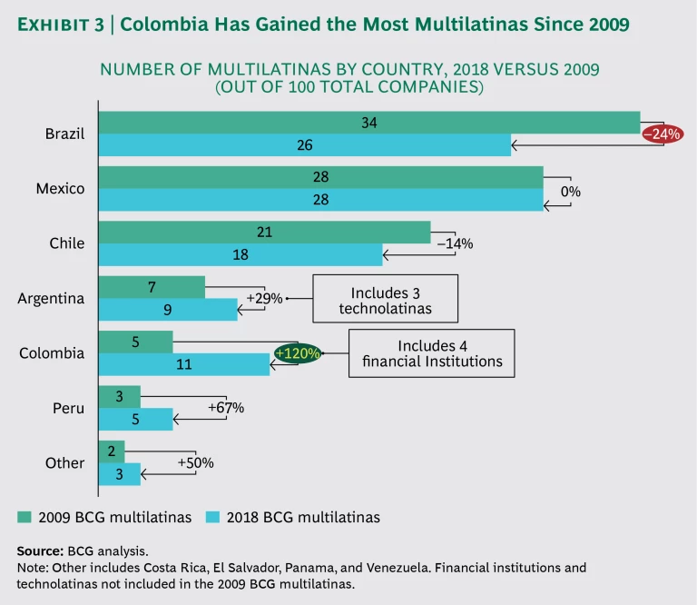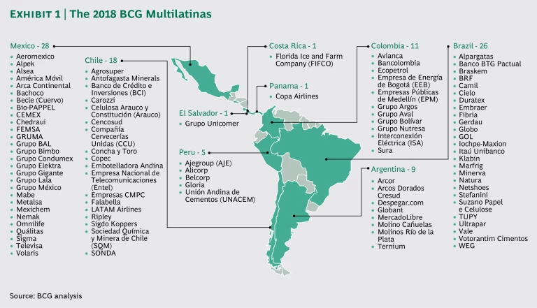 There were some interesting shifts in the geographic distribution of the BCG multilatinas. In 2009, Brazil. Chile, and Mexico accounted for three-fifths of companies on the list. This year, companies are more spread out, with greater representation from Argentina, Colombia, and Peru; companies from Costa Rica, El Salvador, and Panama also made the cut.
