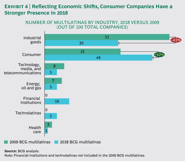 - A Larger Presence of Consumer Companies. The share of multilatinas specializing in consumer goods and services that meet the needs of the expanding middle class increased from 31% to 44%. The number of commodity companies fell from 12 to 7, largely owing to the downturn in commodity prices.