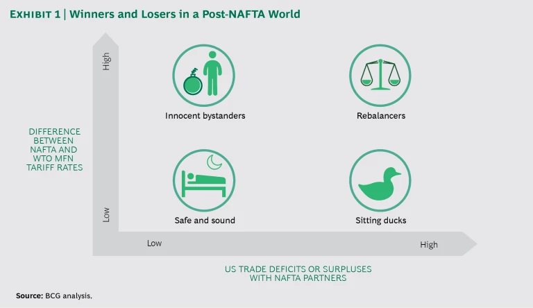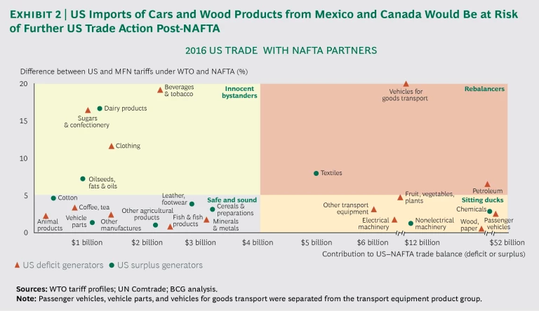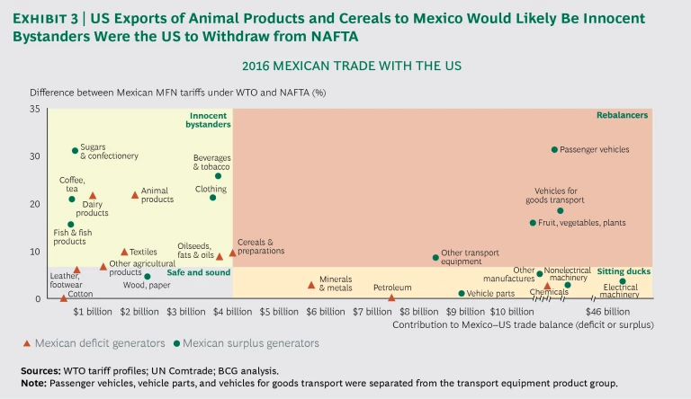 Some business leaders still hope that the economic impact of NAFTA’s demise will be manageable. One prominent school of thought goes like this: since the US, Mexico, and Canada are members of the World Trade Organization, tariffs for most products will remain relatively low, even without NAFTA. While this may be true in the aggregate, however, average Mexican WTO tariff rates of 7.4% are about twice as high as those of the US. For some product categories, Mexican tariffs are well into the double digits. What’s more, and as we have argued previously, in sectors where US WTO tariffs are low and US trade deficits are high, the Trump Administration could well be expected to take further protectionist action in order to achieve its overarching goal of trade deficit reduction. (See “Three Things CEOs Should Do Now to Prepare for the New NAFTA,” BCG article, November 2017.) Furthermore, Mexico and Canada could retaliate against such US action by imposing restrictions on US products that currently enjoy favorable trade terms and high sales volumes into their markets, such as agricultural products, machinery, and chemicals.