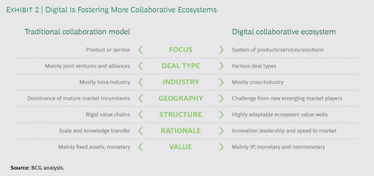 And keep in mind that digital strategies in many industries are increasingly also ecosystem strategies. Rarely does a company have in its organization all the necessary elements (expertise, intellectual property, customer access, and so on). (See Exhibit 2 for a list of the characteristics such ecosystems share.)