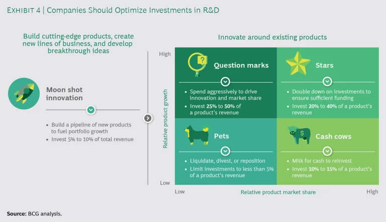 Companies that derive a large share of revenue from legacy products whose market share is high but whose growth potential is flat or declining should allocate their R&D spending to two endeavors. The first is moon shot innovation that builds cutting-edge products, creates new lines of business, and develops breakthrough ideas. The second is innovation that is closely related to existing products. (See Exhibit 4.) These companies should earmark 5% to 10% of their total revenues to moon shot innovation.