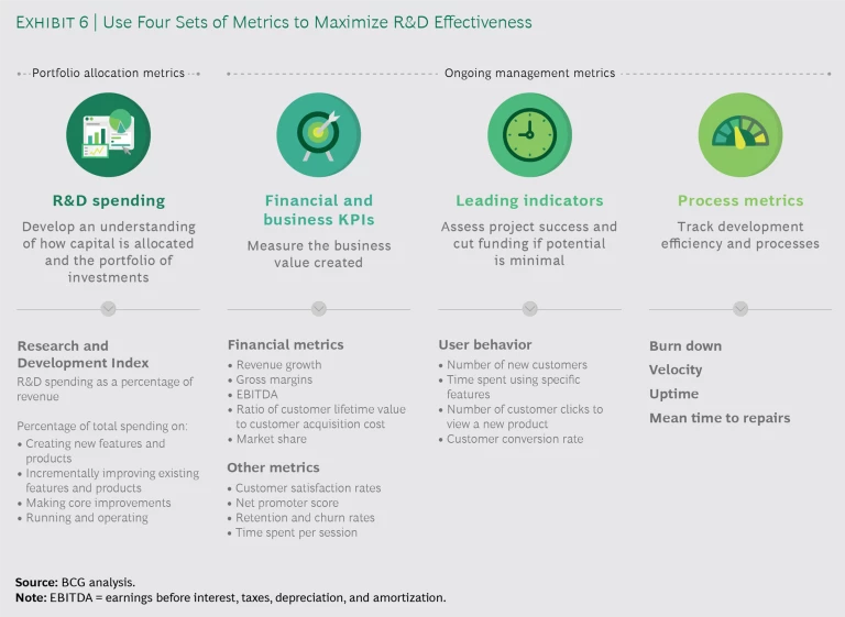 In addition to portfolio allocation metrics, however, companies need three ongoing management metrics: financial and business KPIs to measure value created, leading indicators to see if a project or product is on track to deliver value, and process metrics to track if engineering processes are working as designed. (See Exhibit 6.)