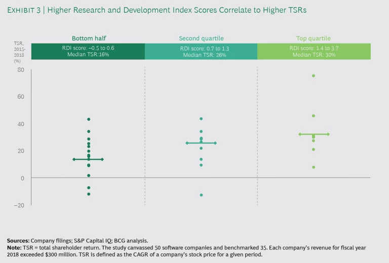RDI is a powerful measure of R&D effectiveness. And by correlating the score of each company in our analysis to its total shareholder return (TSR), we found that companies with higher RDI scores also had higher TSRs—a correlation that held true for one-, three-, and five-year time periods. (See Exhibit 3.) TSR is the metric that many investment funds prefer to use to assess company performance, because TSR incorporates multiple performance factors: revenue growth, change in margins, valuation multiples, and direct distributions of free cash flow to shareholders.