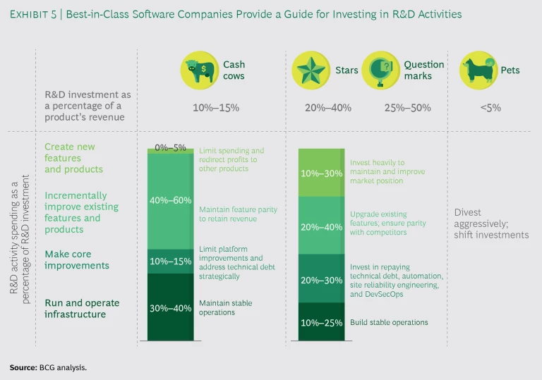 - The cash cows are legacy products whose market share is high but whose growth is flat or declining. Companies should invest just enough to maintain feature parity with competitors’ products and stem a rapid decline in revenue. Companies should minimize investments in code refactoring, improvements that are unrelated to paid features, and advancements to the software platform. Best-in-class companies usually commit 10% to 15% of each product’s current revenue to R&D.