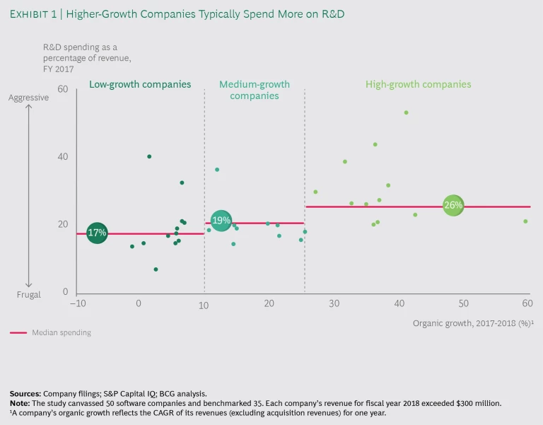 Let’s tackle the first question: How should software companies assess the impact of R&D investments? Our analysis of 35 publicly traded software companies shows that the median R&D spending among high-growth companies is 26% of revenues. (See Exhibit 1.) High-growth companies, such as those in the cloud computing segment, tend to spend more on R&D than low-growth companies, such as those in the traditional middleware segment.