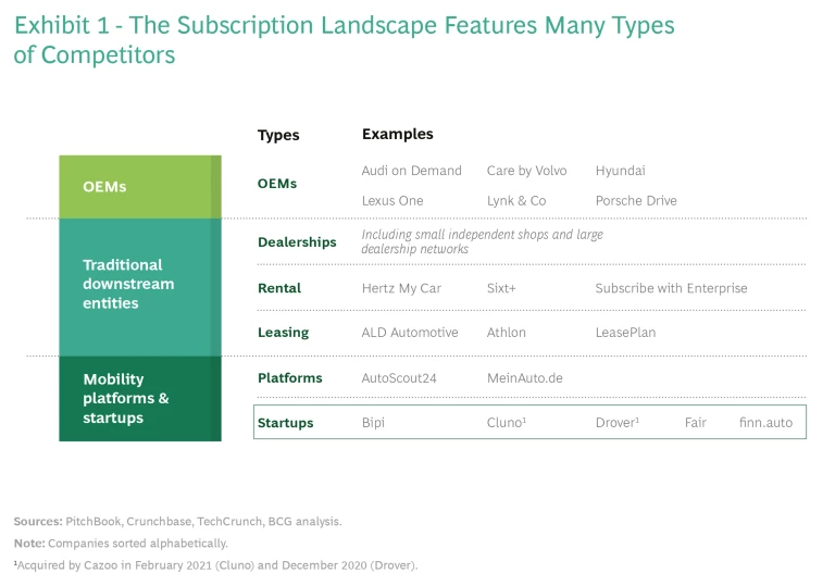 OEMs were among the first to offer car subscriptions. Audi Select (merged into Audi on Demand) was launched in 2014. Other OEM offerings included Care by Volvo, Porsche Drive, Lexus One, Access by BMW (since abandoned), Book by Cadillac (suspended), Mercedes-Benz Collection (since abandoned), Jaguar Land Rover’s Carpe (now Pivotal), and additional services from Nissan and Hyundai. The ecosystem of providers includes two other broad groups: traditional automotive downstream entities (dealerships, rental companies, and leasing companies), and digital mobility companies and startups, such as Fair, Cluno, Drover and Bipi, which have exploited the relatively low barriers to entry with a disruptive business model. Online car marketplaces such as AutoScout24 are tapping into the space via partnerships. Cazoo, the British online car seller, has entered the subscription market by acquiring Drover (in December 2020) and Cluno (in February 2021). (See Exhibit 1.) Cazoo aims to go public on the NYSE via a special purpose acquisition company (SPAC).