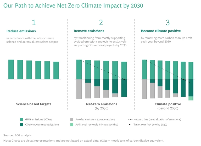 One year ago, in a landmark moment in BCG’s history, we announced a bold new commitment to achieve net-zero climate impact by 2030 and, from there, to become climate positive, removing more carbon from the atmosphere than we emit each year. (See the exhibit.)