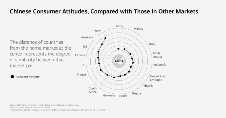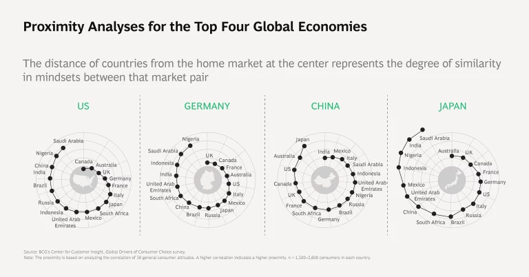 China and Japan, however, are practically islands unto themselves when it comes to consumer attitudes. This is reflected in the fact that even the most similar countries in terms of attitudes are quite far away from China and Japan in our proximity analyses, and, therefore, significantly different. For instance, the proximity spirals for China and Japan show that no other nations are in the inner circles.