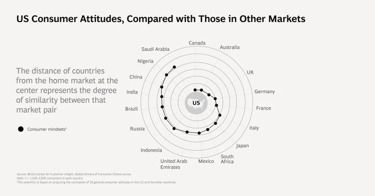 We did find strong similarities among consumers in the US, Canada, Australia, and the UK, all of which share a common cultural heritage. We observed a correlation of 93% to 96% across all 56 attitudes. The countries that are most different from the US when it comes to consumer attitudes are China, Nigeria, and Saudi Arabia.