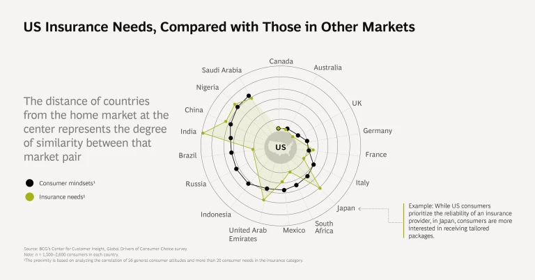 What’s more, we found that similarities in consumer mindsets in two countries don’t necessarily mean that consumer needs for a product category are similar as well. Even among markets with apparently like-minded consumers, the motivations that drive them to consume a certain snack, buy a car, or choose an insurance policy, for example, can be dramatically different. Just as surprising, we learned that two markets with dramatically different cultures can share similar needs for specific products. Chinese and Mexican consumers, for example, have very little in common by way of mindsets—and yet their needs when purchasing insurance are remarkably aligned.